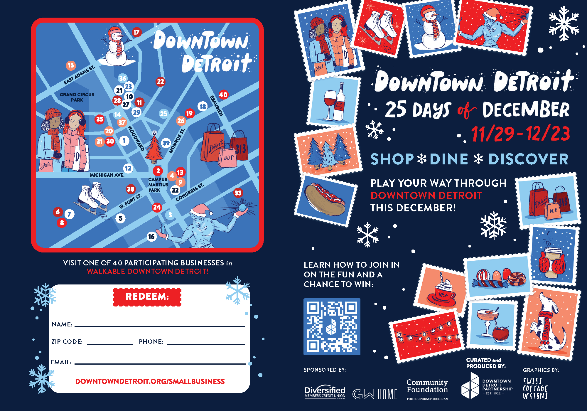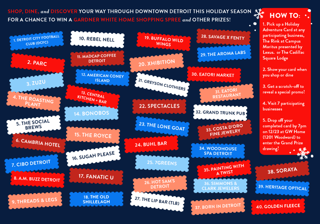 We’ve been working on something uniquely Detroit for the holiday season to support Downtown business owners. 25 Days of December kicks off Saturday, Nov. 29 and runs through Tuesday, Dec. 23, to encourage patrons to shop local. Thank you to all the local shops, restaurants, and cafés who agreed to participate. We look forward to seeing this campaign come to life and bring traffic to Downtown Detroit!